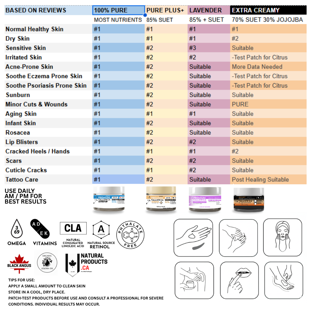 If you are wanting the most nutrient dense type of tallow with the most neutral scent and quicker absorbing texture then buy Suet over Tallow.