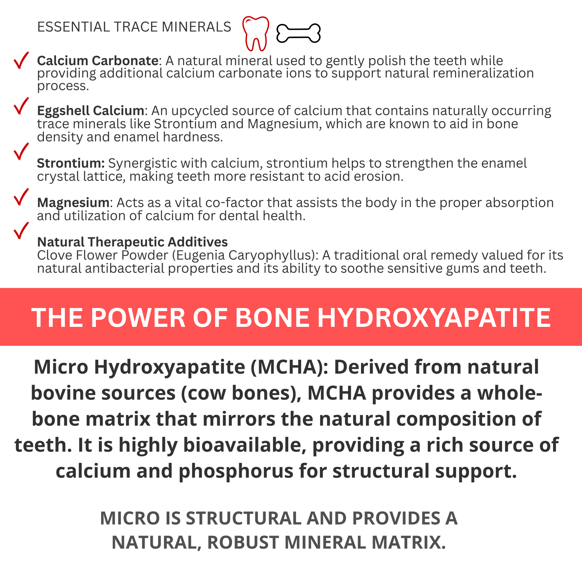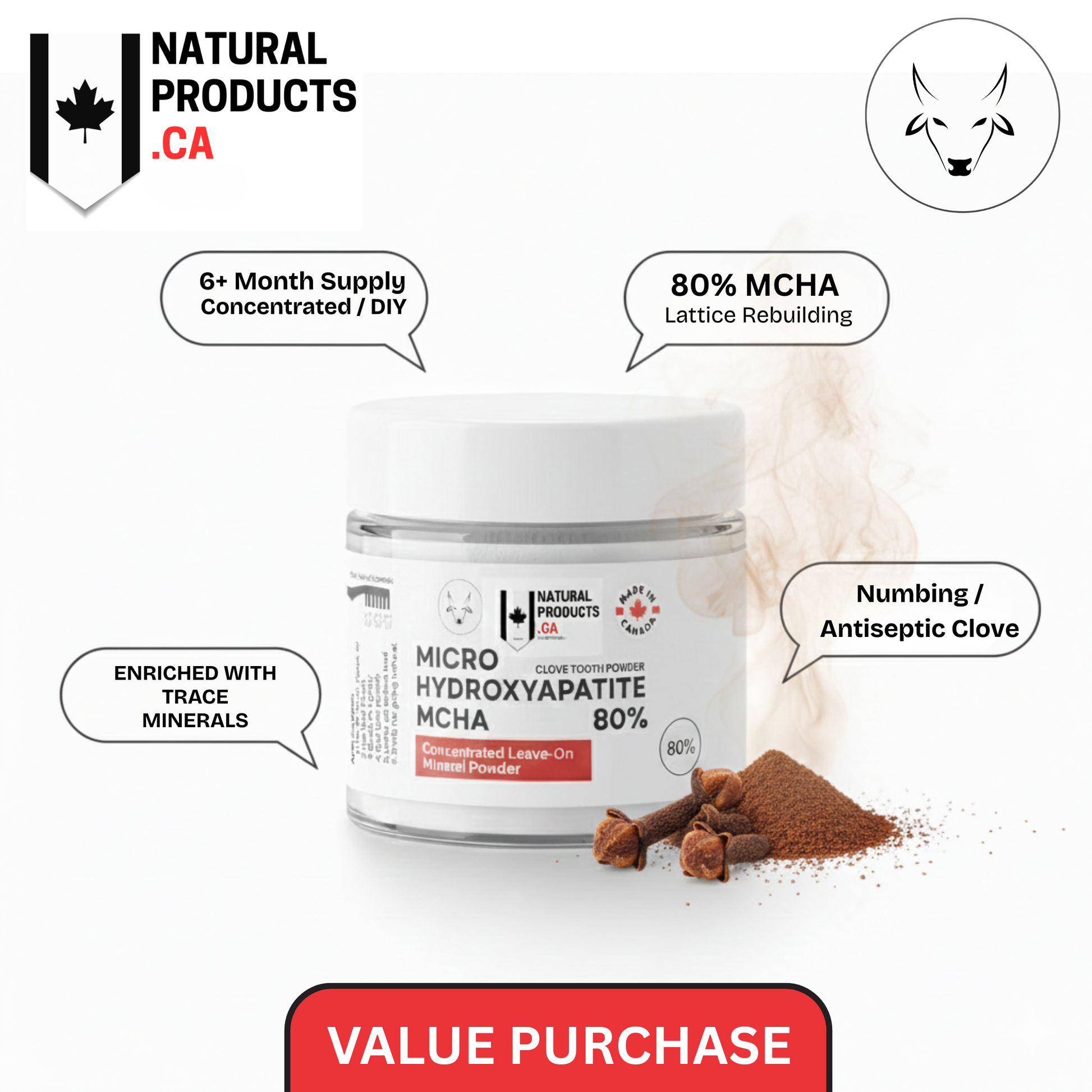 Elevate your dental care with the gold standard of remineralization (what we ourselves use). Our Micro Hydroxyapatite (MCHA) 80% formula is a concentrated, professional-grade mineral powder crafted in small batches in Kamloops, BC. Designed for those who seek a non-toxic, highly effective alternative to traditional toothpaste, this "naturally sourced powder" provides deep structural support for a stronger, healthier teeth & bone health.